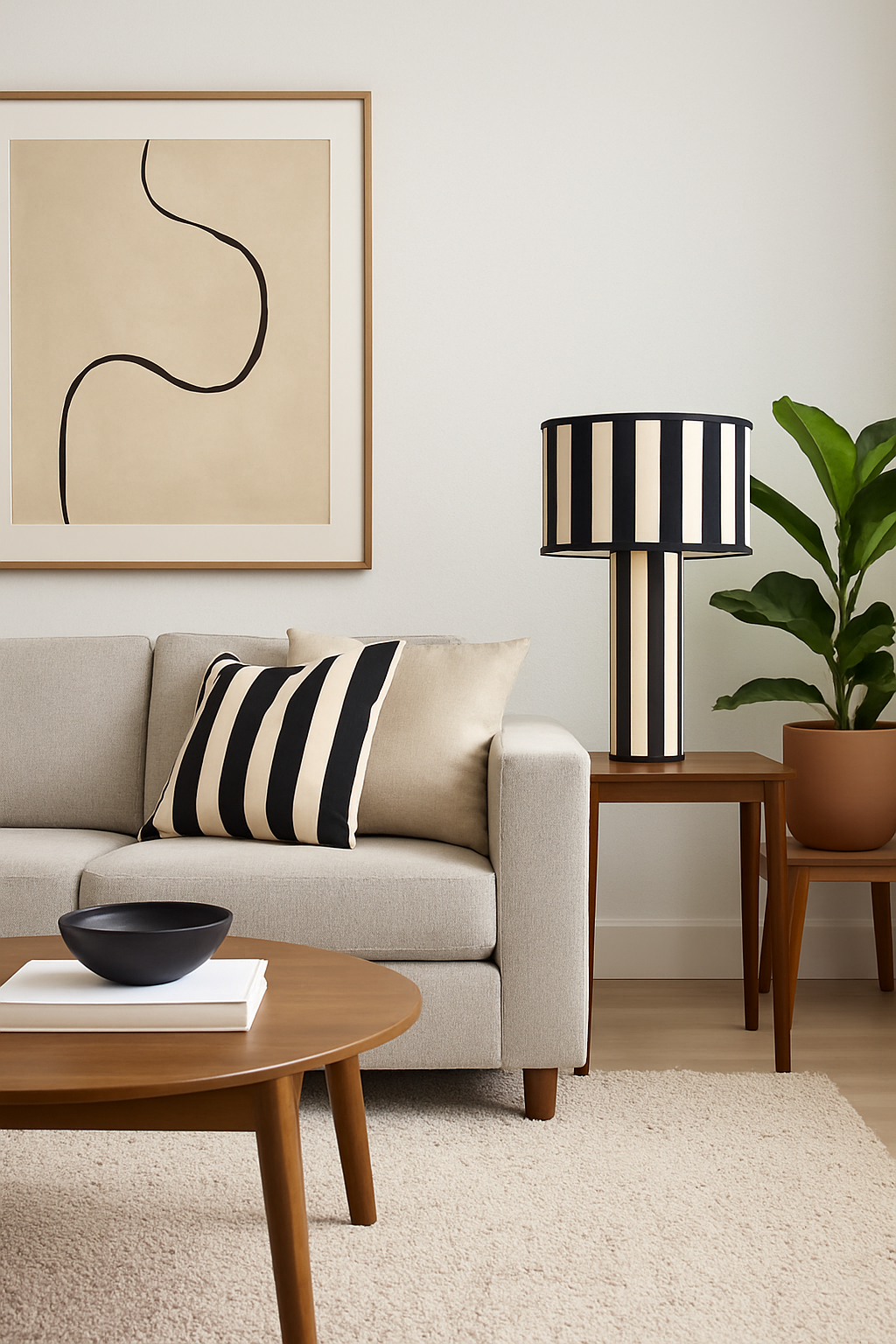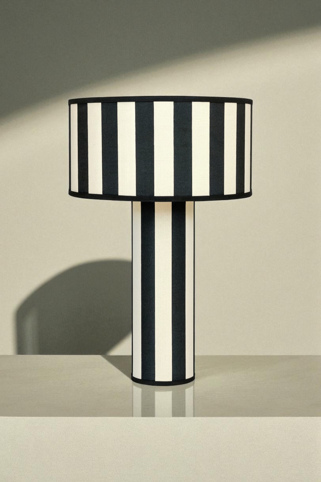 The "Zebrano" luminaire combines contemporary aesthetics with graphic boldness. With its characteristic black and white striped design, it stands out in any space, adding a dynamic yet elegant touch. It has a total height of approximately 57 cm., while his cloth hat with a diameter of 35 cm. diffuses light with warmth and style. Ideal for modern bedrooms, living rooms or commercial spaces with character.
