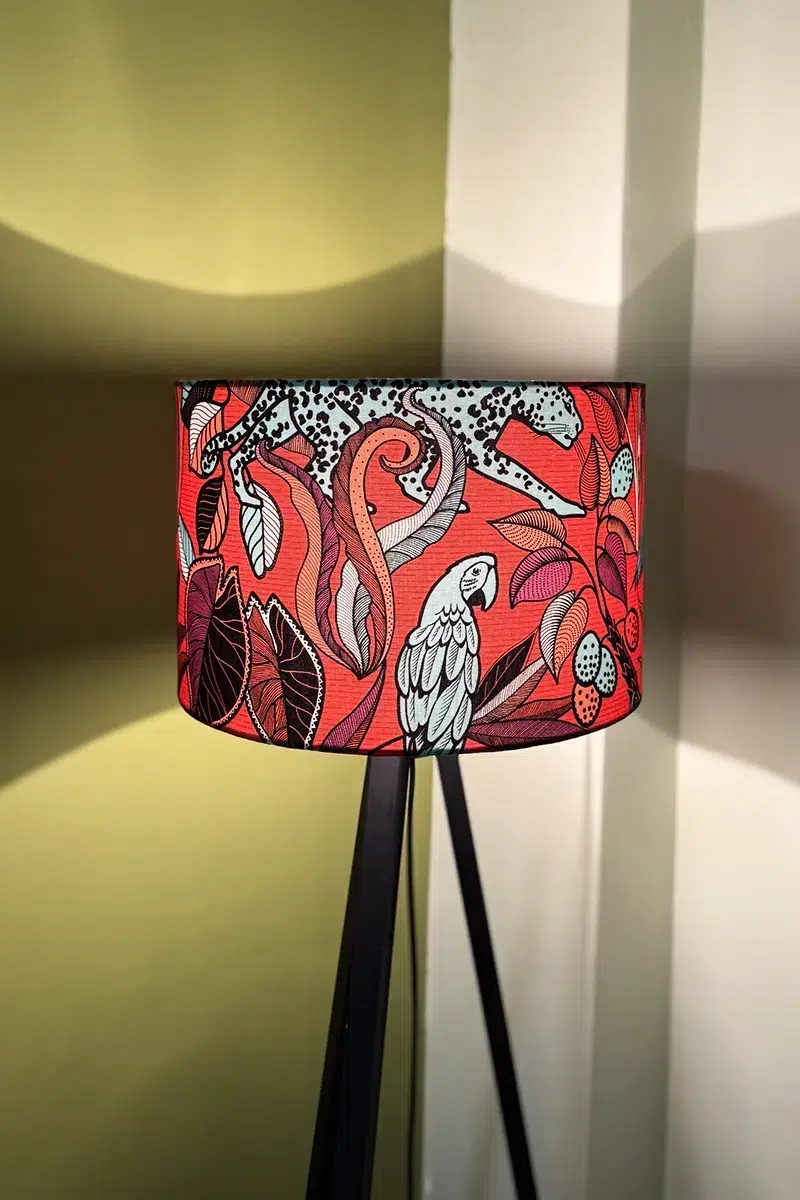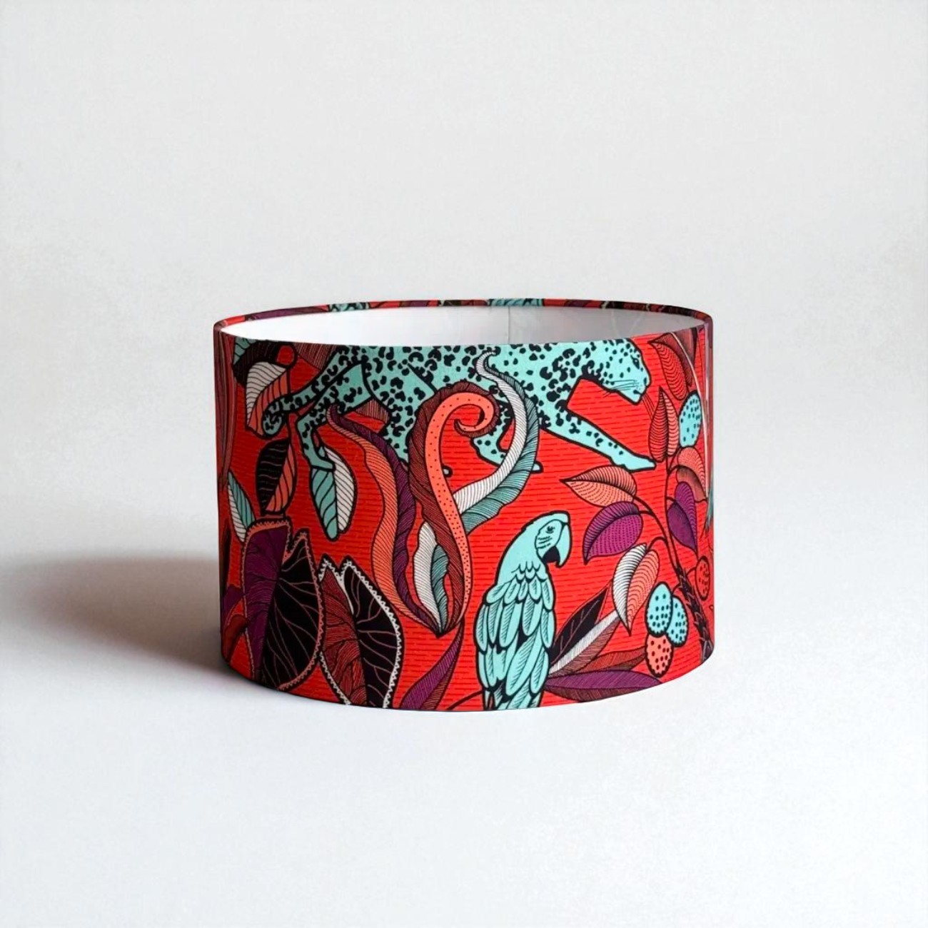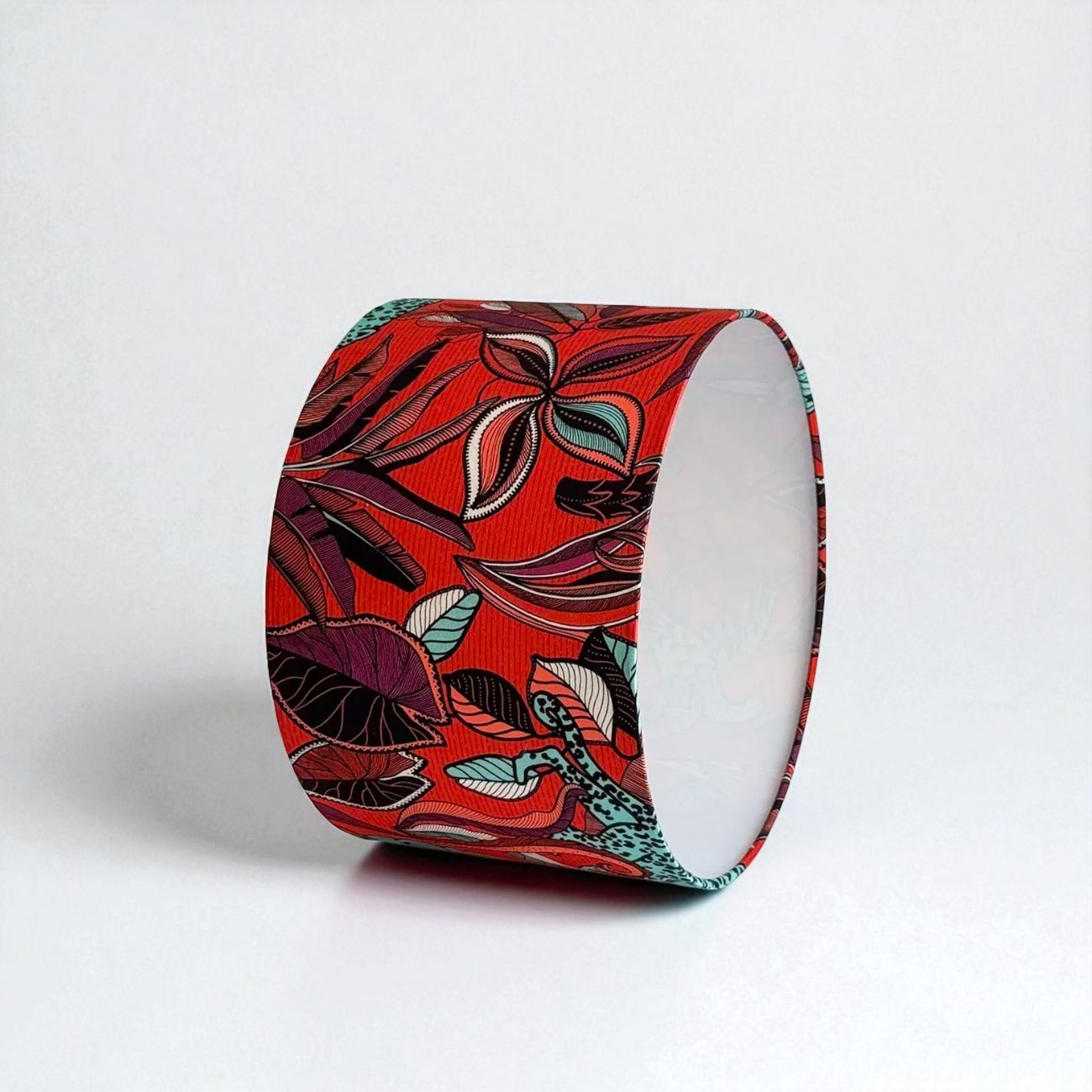 Ένα εντυπωσιακό καπέλο φωτιστικού με κόκκινο φόντο, διακοσμημένο με ζωηρές εικόνες ζούγκλας Το “Red Jungle” φέρνει ένταση, ζωντάνια και μια εξωτική αύρα στον χώρο σας, δημιουργώντας μια μοναδική ατμόσφαιρα γεμάτη ενέργεια και περιπέτεια.