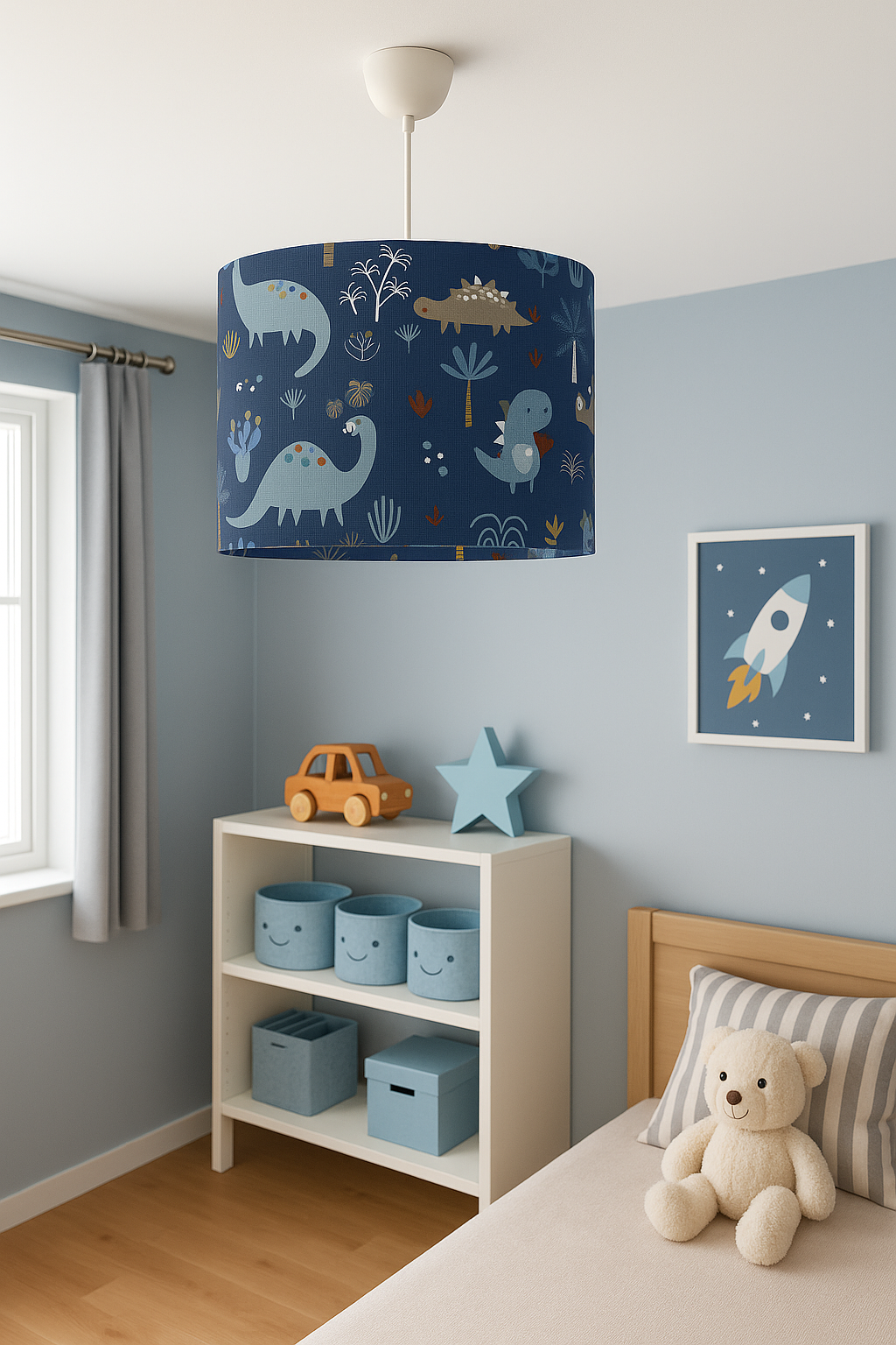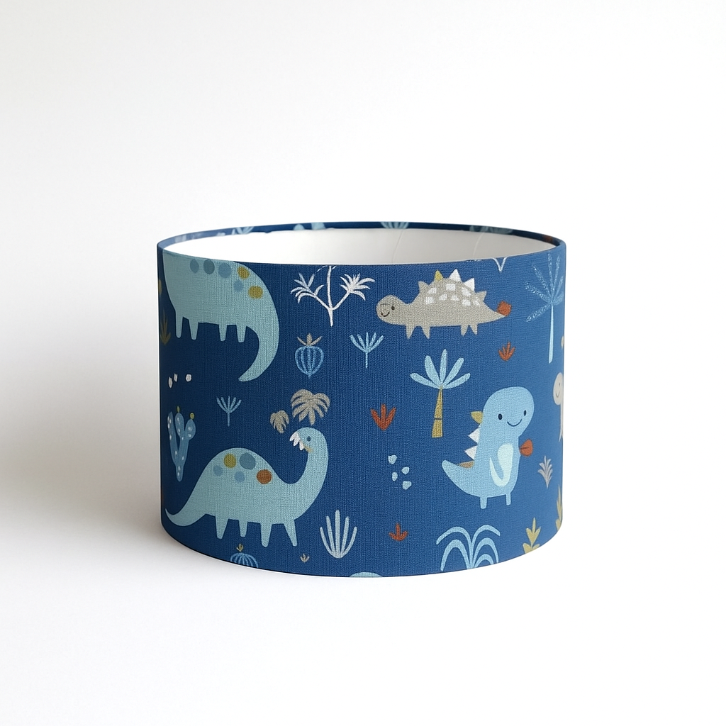 Καπέλο φωτιστικού οροφής σε μπλε απόχρωση με χαριτωμένα δεινοσαυράκια, ιδανικό για να χαρίσει ζωντάνια και παιχνιδιάρικη διάθεση στο παιδικό δωμάτιο. Με διάμετρο 35 εκ. και ύψος 23–25 εκ., συνδυάζει όμορφη διακόσμηση και λειτουργικό φωτισμό. Είναι κατασκευασμένο από υψηλής ποιότητας βαμβακερό ύφασμα, που εξασφαλίζει ανθεκτικότητα και κομψό φινίρισμα. Η ανάρτηση περιλαμβάνεται για εύκολη και άμεση τοποθέτηση.