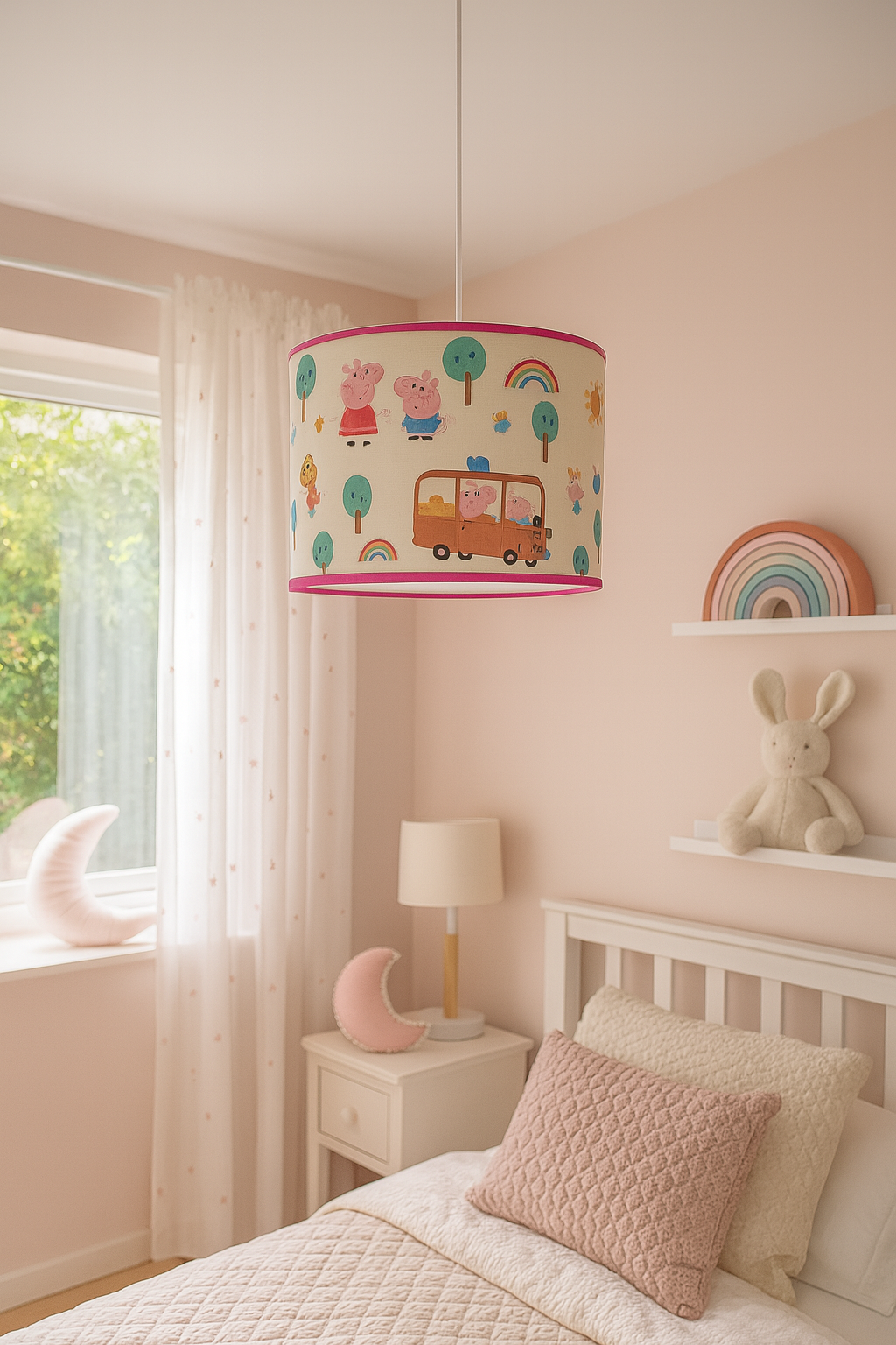Χαρίστε στο παιδικό δωμάτιο χαρούμενη διάθεση και μοναδικό στυλ με το καπέλο φωτιστικού οροφής με την αγαπημένη Peppa Pig! Με διάμετρο 35 εκ., προσφέρει ομοιόμορφο φωτισμό, ιδανικό για καθημερινή χρήση. Το υφασμάτινο καπέλο είναι κατασκευασμένο από υλικά υψηλής ποιότητας, ασφαλή για παιδιά και εύκολα στον καθαρισμό, ενώ τα χαρούμενα χρώματα και το σχέδιο με την Peppa Pig δημιουργούν μια ζεστή και παιχνιδιάρικη ατμόσφαιρα. Στην συσκευασία περιλαμβάνεται και η ανάρτηση με καλώδιο, ώστε να το τοποθετήσετε εύκολα και γρήγορα. Ένα υπέροχο φωτιστικό που θα ενθουσιάσει τους μικρούς φίλους της Peppa και θα κάνει το δωμάτιο ακόμη πιο φωτεινό και φιλόξενο!