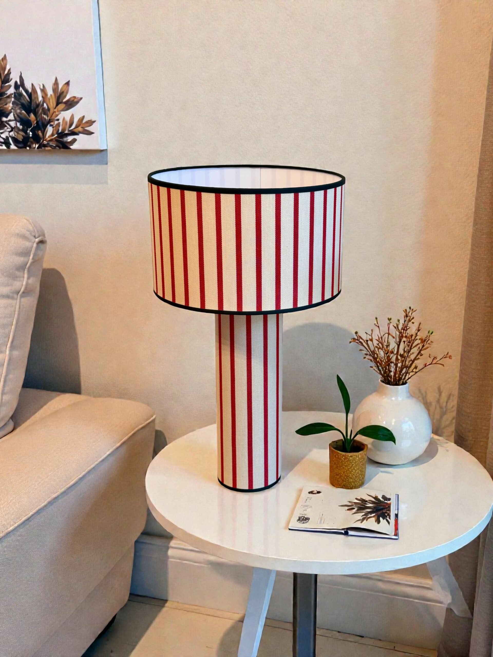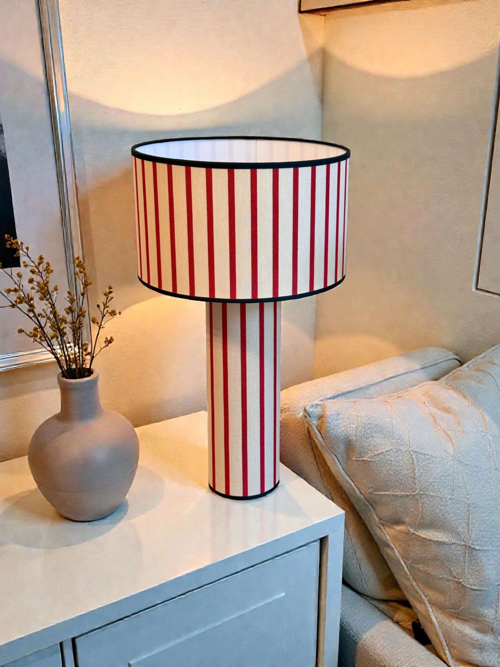 Επιτραπέζιο φωτιστικό με καπέλο ριγέ σε κόκκινο και μπεζ λεπτές ρίγες, από χοντρό outdoor ύφασμα υψηλής ποιότητας, ανθεκτικό και με όμορφη υφή. Η δομή του υφάσματος βοηθά το φως να διαχέεται ομοιόμορφα, δημιουργώντας ζεστή και κομψή ατμόσφαιρα σε σαλόνι, τραπεζαρία ή υπνοδωμάτιο.
